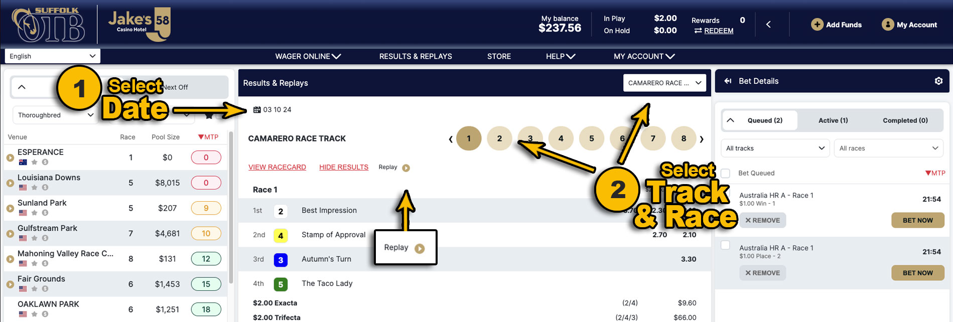 Using the Bet Pad, choose the track name then race number from the race selector. The results for that race will appear on the Bet Pad. Replay is available if you see