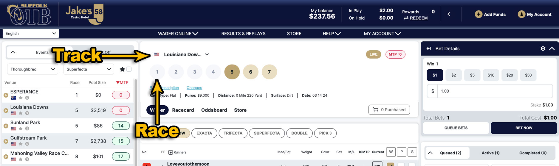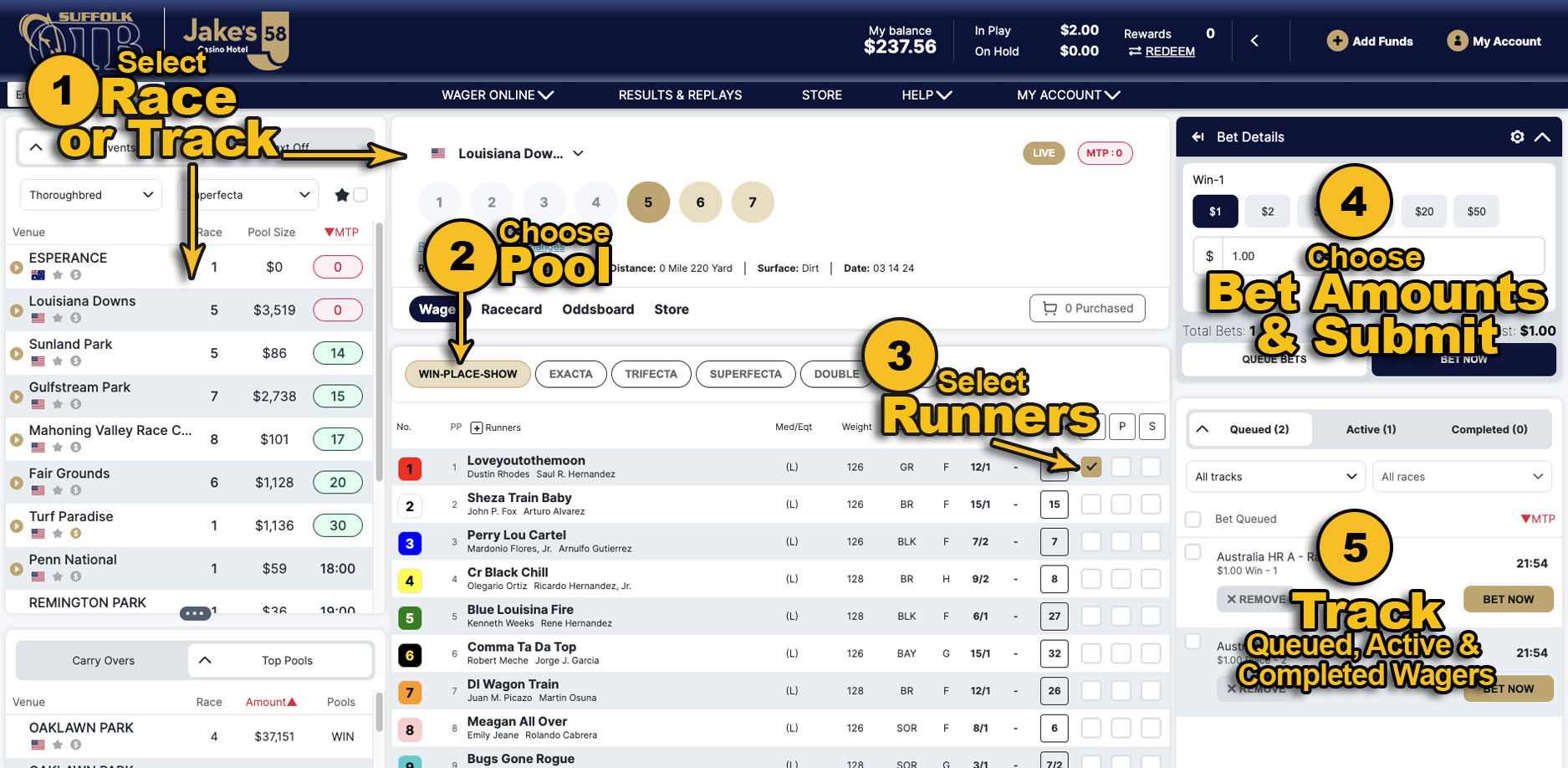 Select your race, choose your pool, select your runners, choose your wager amounts then place your wager. You can also queue wagers to be submitted later.